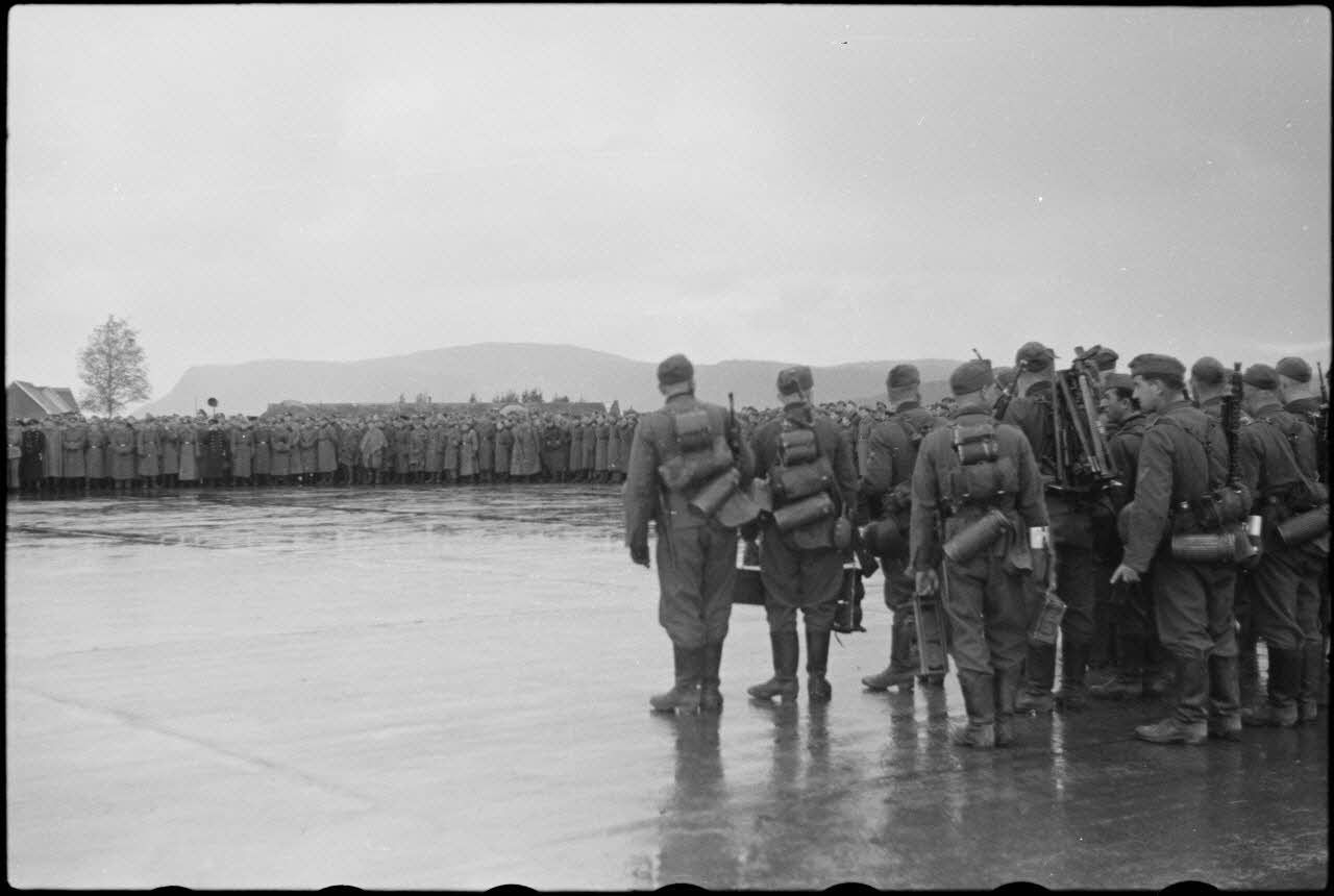 Mise en place des troupes pour une prise d'armes marquant le début d'une démonstration aéroportée du 8./LLG 1 (Lulftlandegeschwader 1) sur le terrain d'aviation de Trondheim-Vaernes (Norvège).