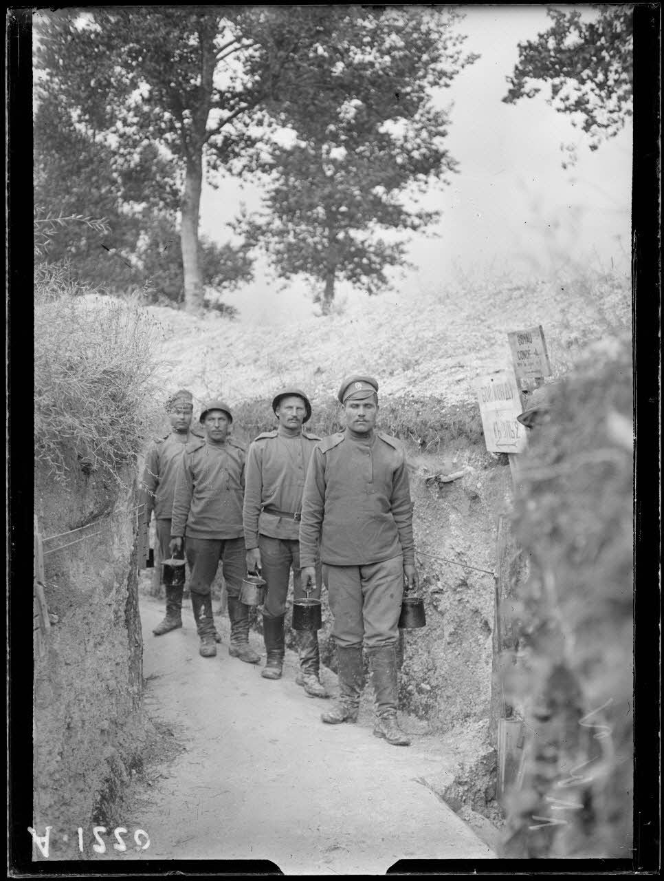 Mission de Mr Variot. Voyage à la brigade russe. Secteur d'Auberive. Boyau coudé. A. Soldats portant la soupe. [légende d'origine]
