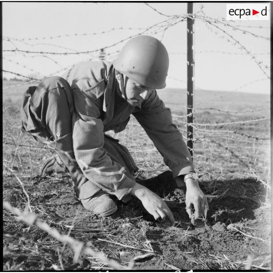 Les militaires français aménagent un réseau de barbelés à la frontière algéro-marocaine, pour empêcher les incursions d'armes et d'indépendantistes algériens en provenance du Maroc. Pour rendre cette frontière infranchissable, ils renforcent le dispositif par la pose de mines antipersonnels. Une mitrailleuse Hotchkiss pare à toute tentative d'infiltration.