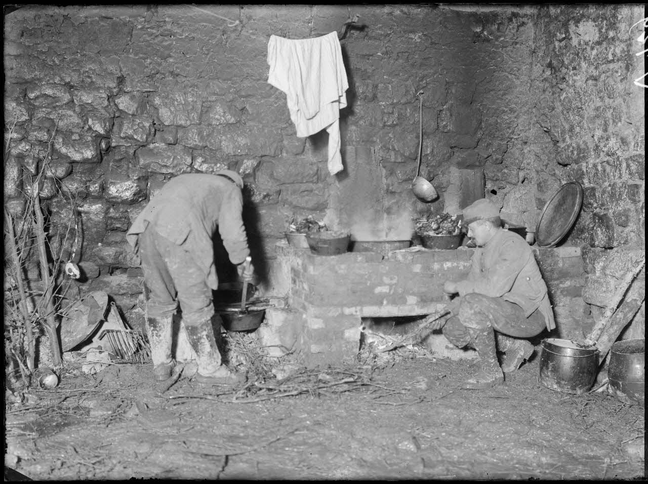 - Á Moiremont (Marne, 03/12/1915, V 123, V 127 et V 129) la vie quotidienne des combattants s'organise dans les maisons. Une forge de campagne et une cuisine répondent aux besoins des unités qui sont ravitaillées par les chariots des trains des équipages.