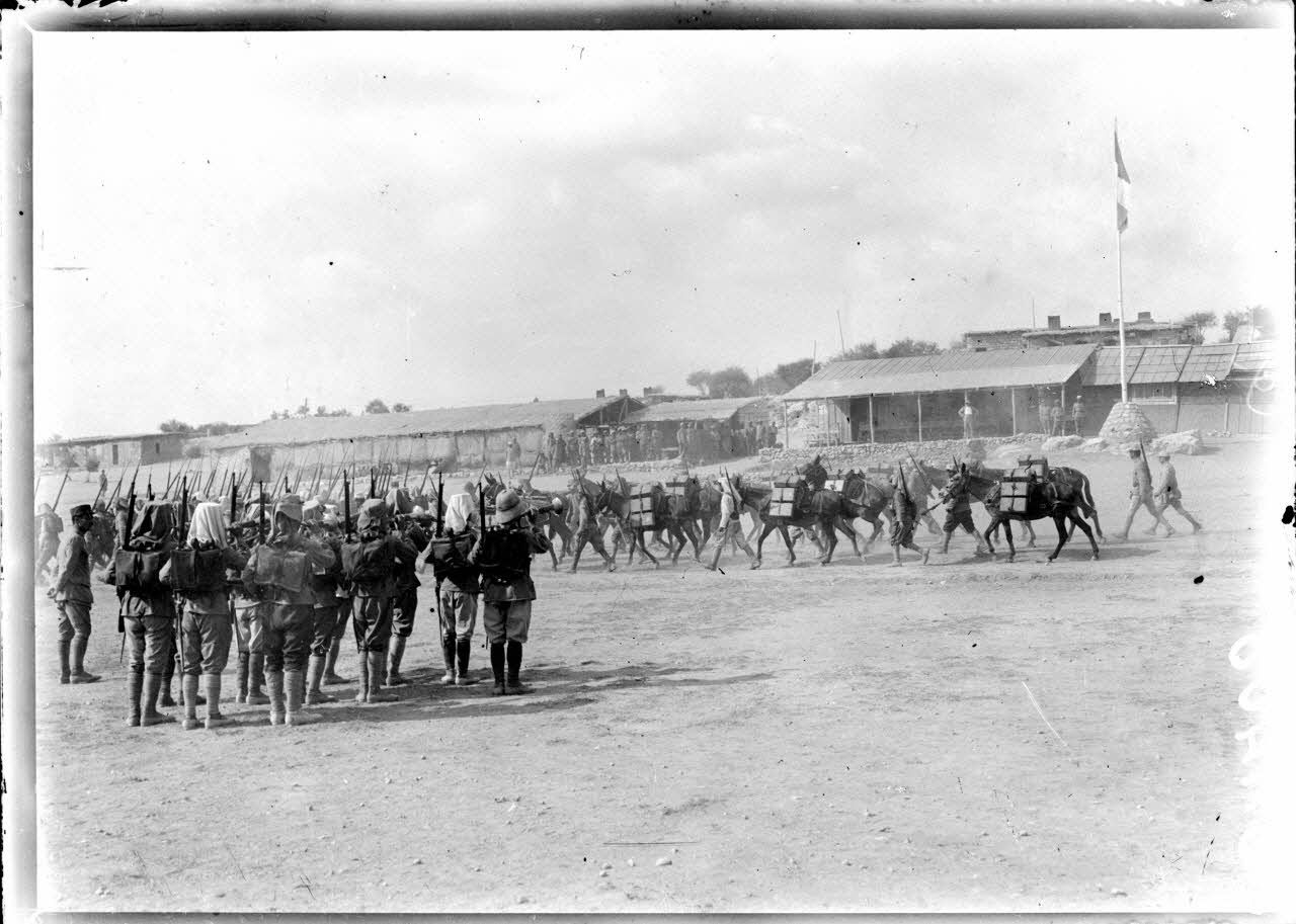 Revue d'un bataillon et défilé des troupes et des mulets avec leur chargement ;