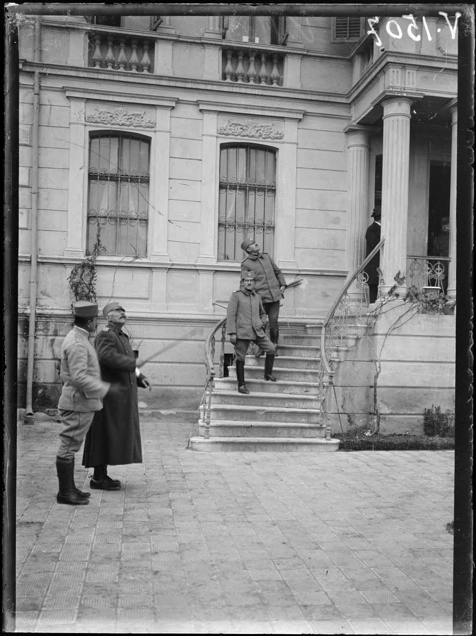 Monastir. Arrivée du prince de Serbie, des généraux Sarrail et Leblois. Arrivée à la préfecture. [légende d'origine]