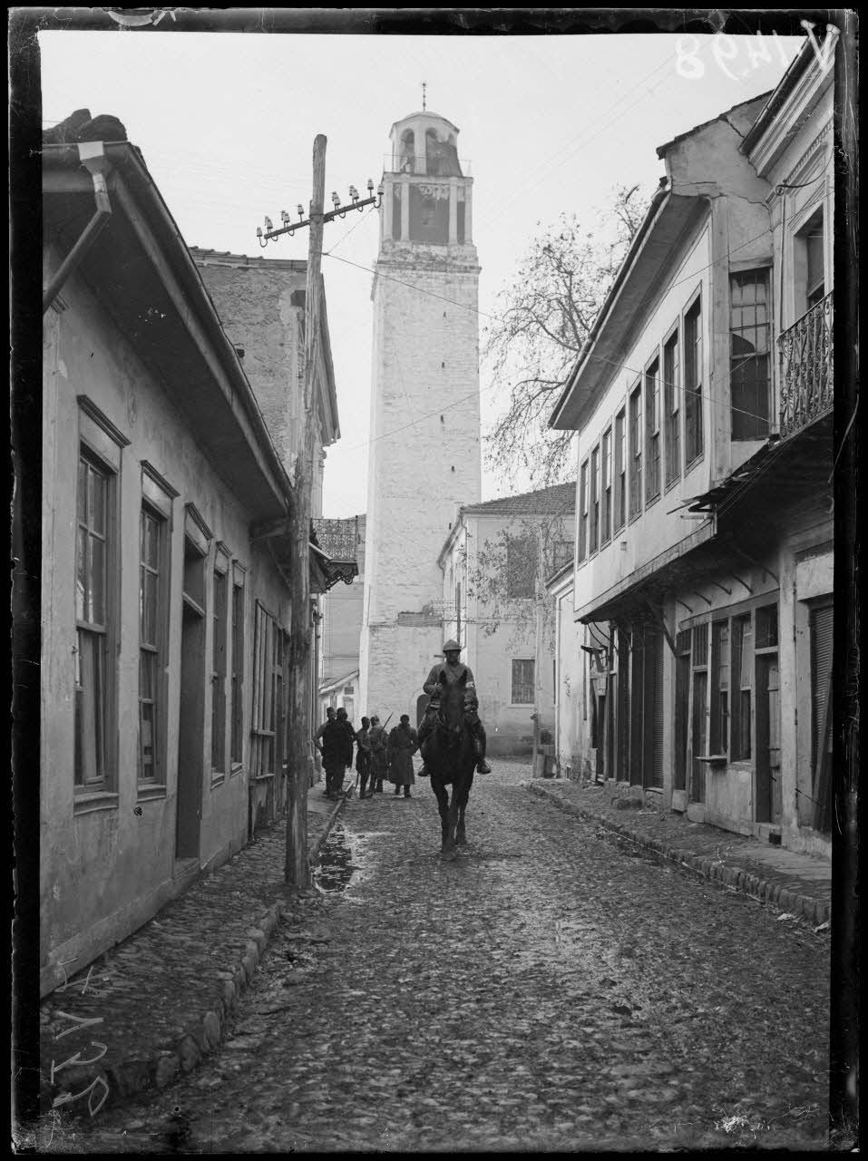 Les prisonniers bulgares regardent les troupes et automobiles françaises pénétrer la ville de Macédoine, ses rues et sa tour carrée.