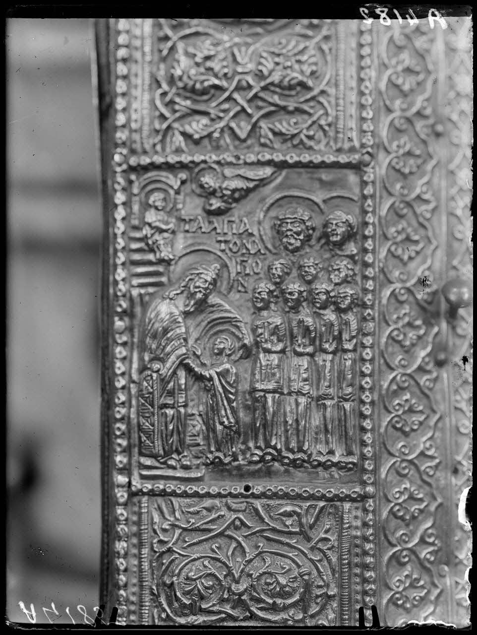Mont Athos, monastère de Vatopédi. Détail d'un revêtement, métal retourné, figure émail.