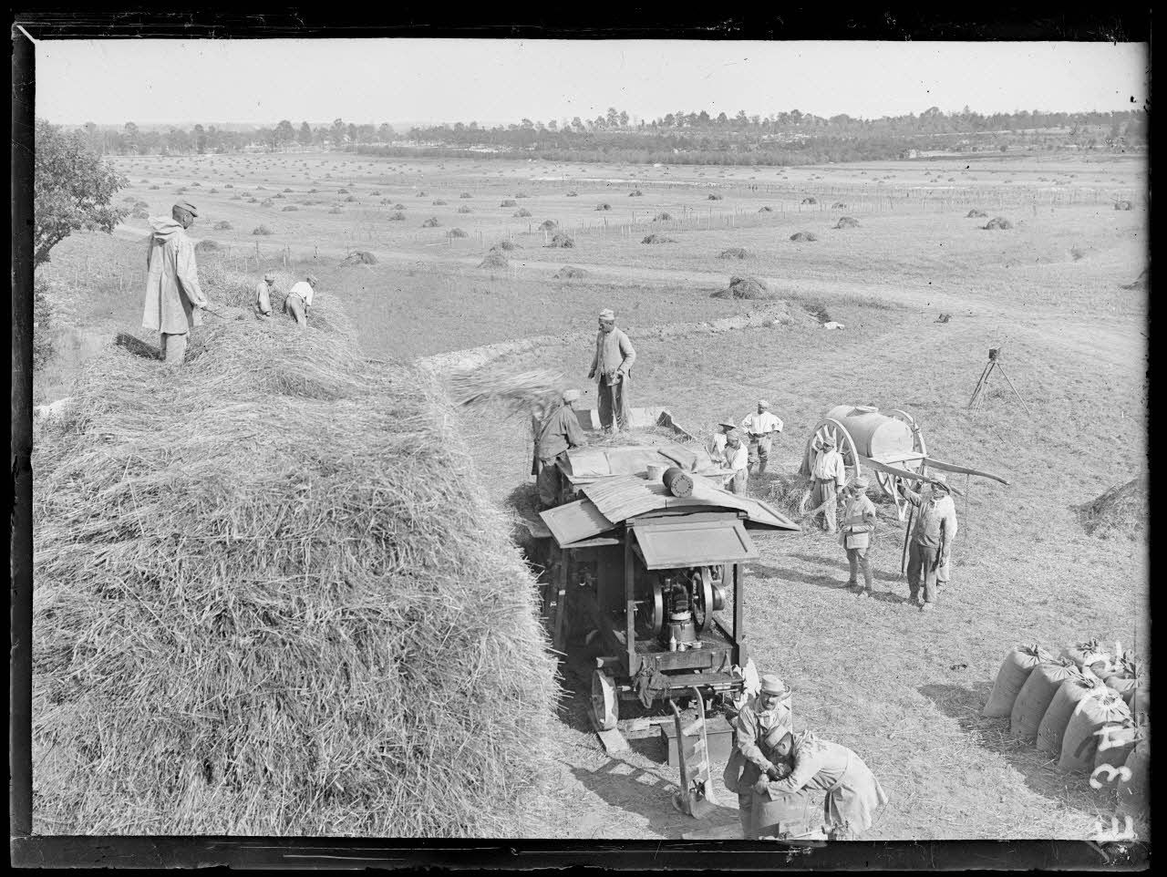 Ferme d'Alger. Marne. Equipe militaire agricole au travail ; le battage du blé et la mise en sac.