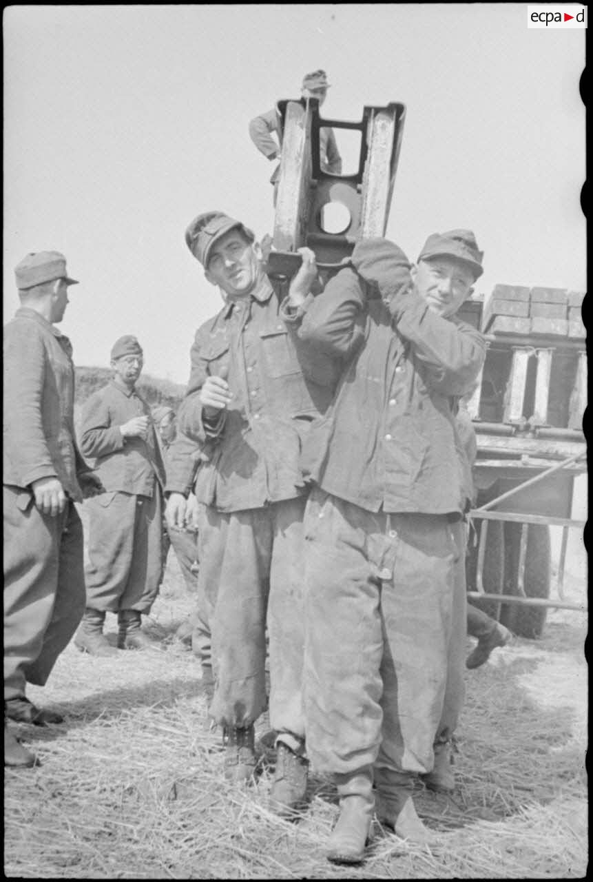 Le montage par le Génie allemand de pontons (Brückengerät) qui vont permettre la traversée d'une rivière.