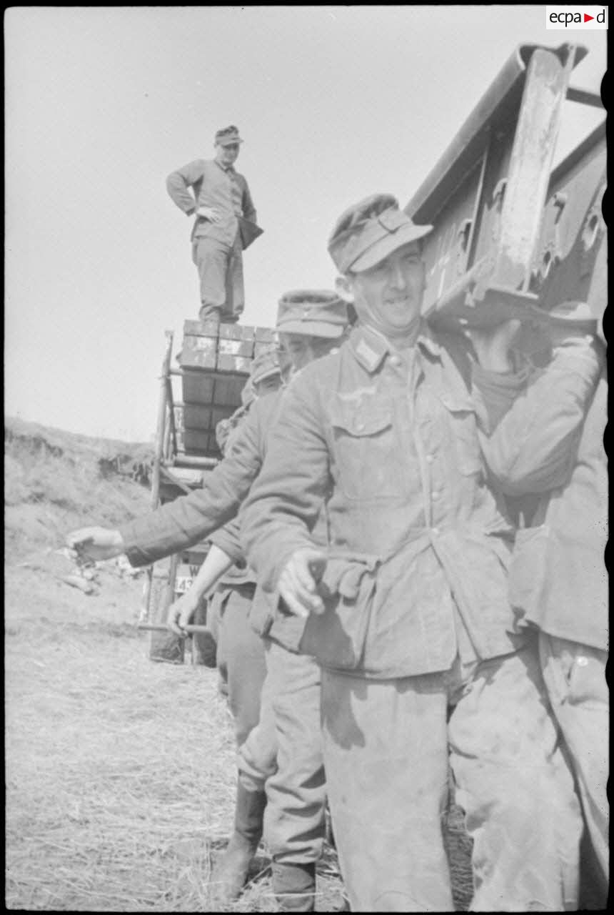 Le montage par le Génie allemand de pontons (Brückengerät) qui vont permettre la traversée d'une rivière.