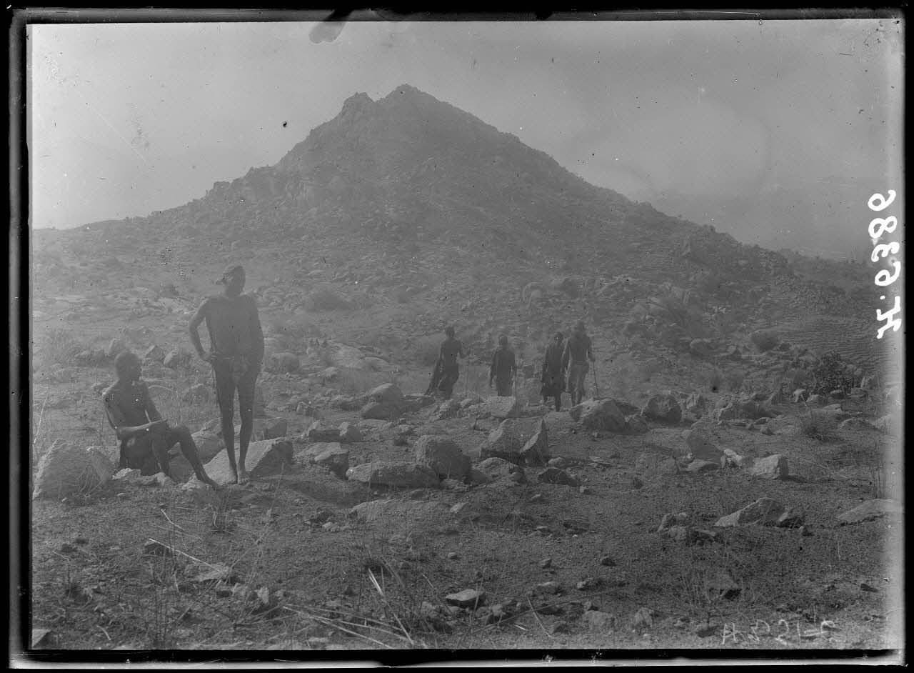 Montagne de Mora. Piton de Gagadéma et à droite, dans le bas, village de Kosséda occupé par les Français. [légende d'origine]