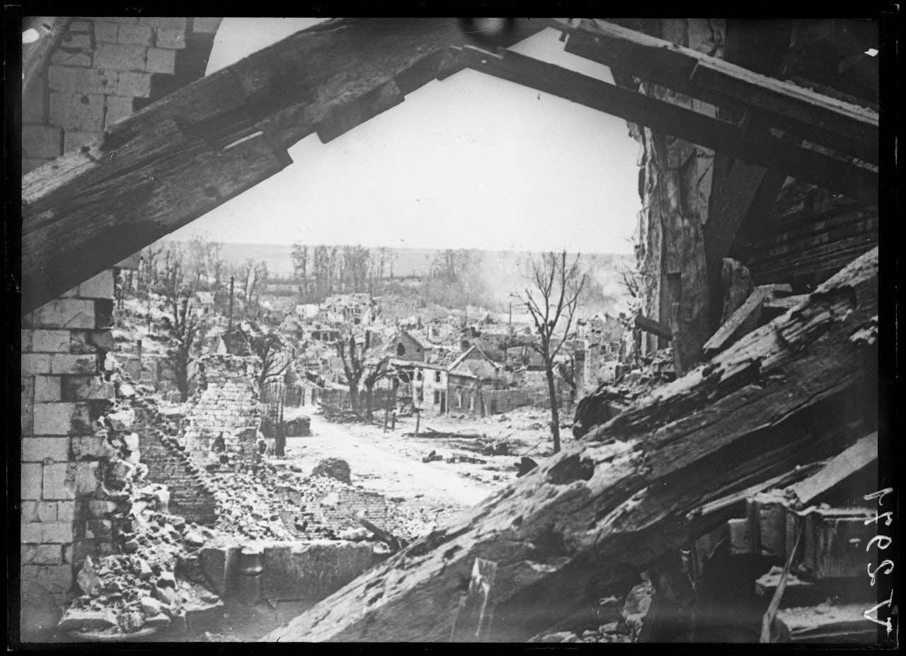 - Dans Montdidier (10/08/1918, V 2966 à V 2986) les troupes de la 60e DI occupe la ville entièrement dévastée. L'église, le palais de Justice et la mairie sont entièrement détruits. La place Parmentier est également dévastée, ainsi que la majorité des habitations.