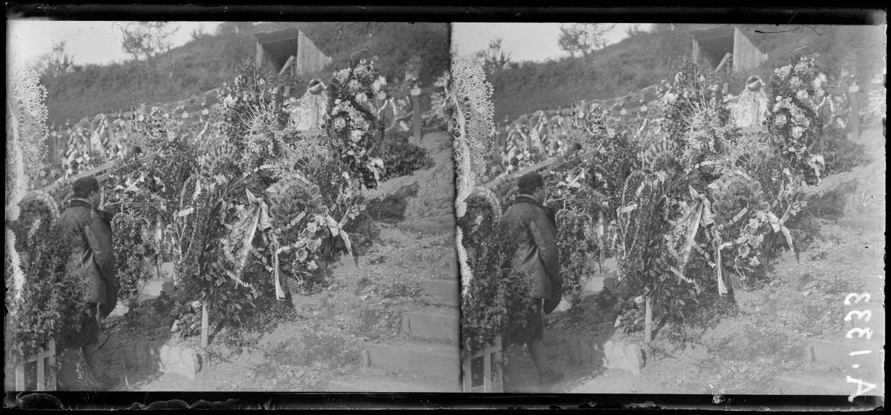 - à Moosch, la tombe du général Serret, un cimetière militaire, une troupe prenant livraison de masques à gaz (A 1333 à A1335),