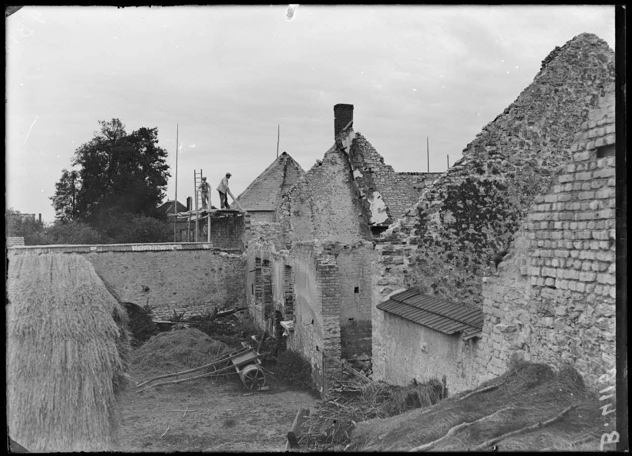 Morains-le-Petit. Un coin du village. Réparation des maisons incendiées par les Allemands en septembre 1914. [légende d’origine]