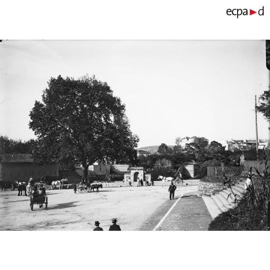 1036. Vue de la fontaine près de la porte. Dans le fond le château O'Neil.