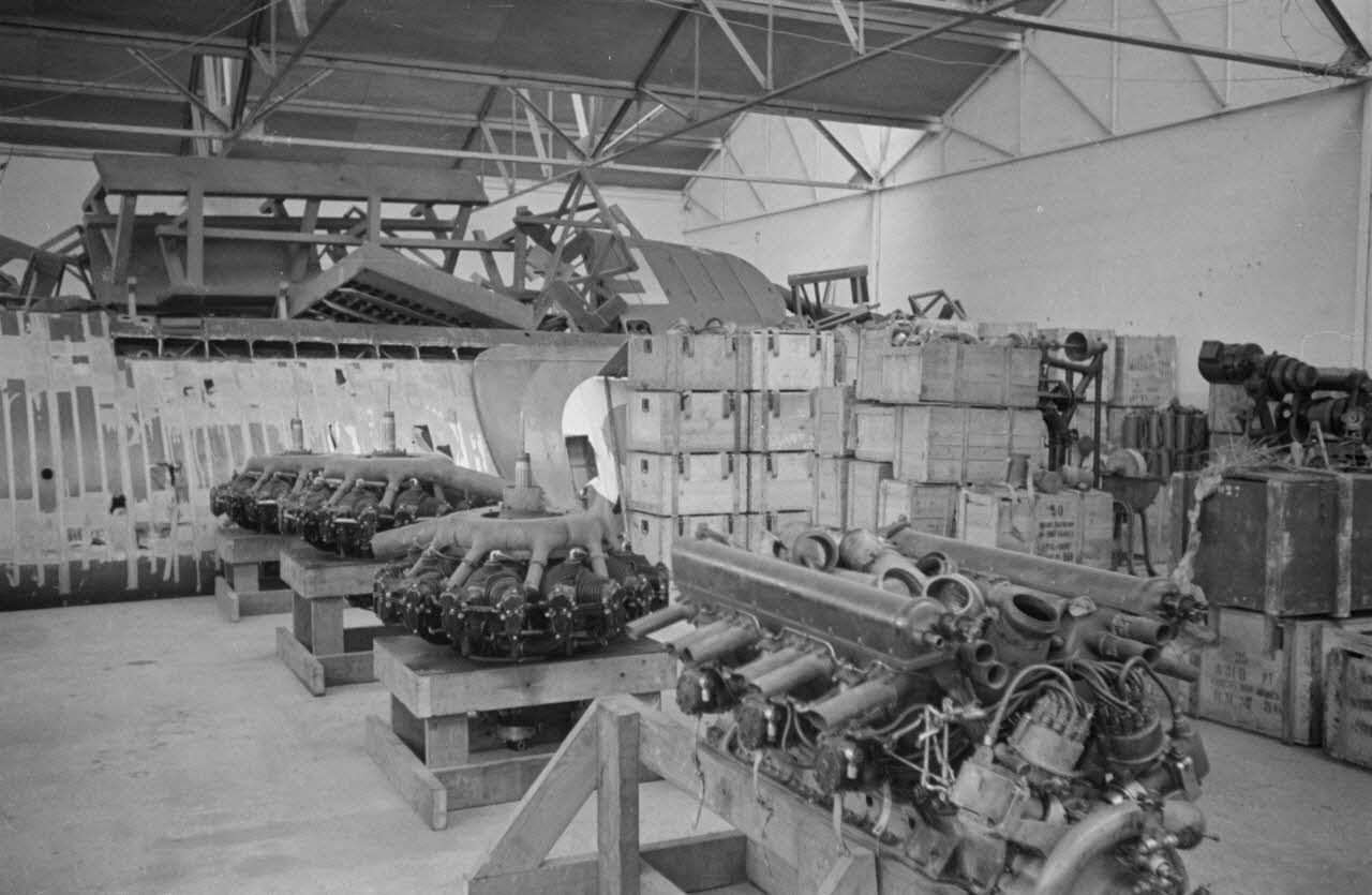 Moteurs dans un hangar du terrain d'aviation de Royan Médis.