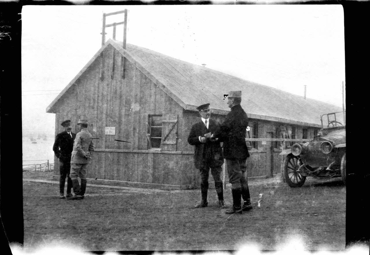 Devant l'état-major de la base de Moudros (île de Lemnos), le colonel Etievant, chef de l'état-major du général Bauman, s'entretient avec le député Monsieur Boussenot.