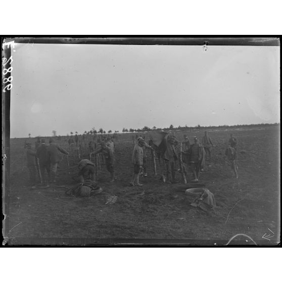 Dans la ferme du Plémont prés de Suippes, des soldats français et italiens travaillent aux ouvrages de soutien, posent des fils barbelés et creusent des tranchées.
