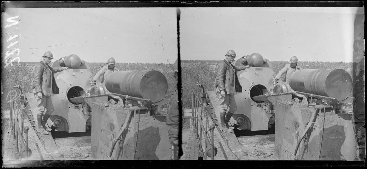 A Mourmelon-le-Petit, un canon de 400 mm est ravitaillé en obus. Une batterie de 32 cm modèle 1870-81 sur affût à glissement Schneider est en position sur un épi. Les artilleurs rectifient la position d’une pièce sur la voie ferrée avec des vérins et un treuil, puis chargent un obus. Le pointeur ajuste le tube et le tir est déclenché. Un poste téléphonique installé dans une tranchée communique avec les observateurs pour le réglage des tirs.