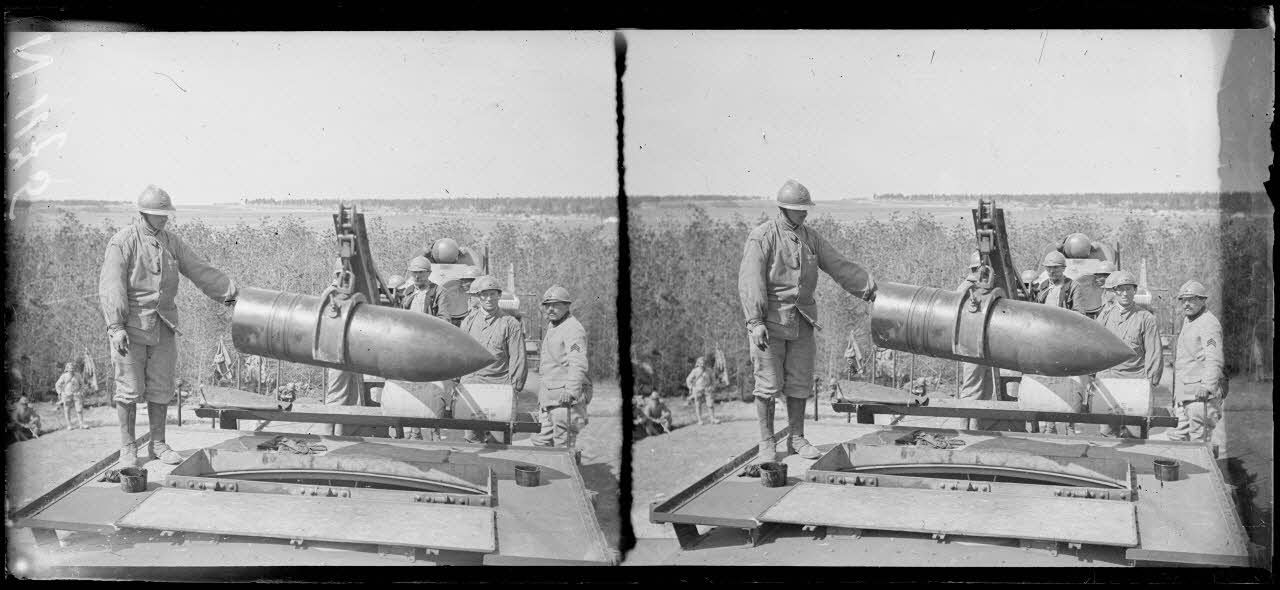 A Mourmelon-le-Petit, un canon de 400 mm est ravitaillé en obus. Une batterie de 32 cm modèle 1870-81 sur affût à glissement Schneider est en position sur un épi. Les artilleurs rectifient la position d’une pièce sur la voie ferrée avec des vérins et un treuil, puis chargent un obus. Le pointeur ajuste le tube et le tir est déclenché. Un poste téléphonique installé dans une tranchée communique avec les observateurs pour le réglage des tirs.