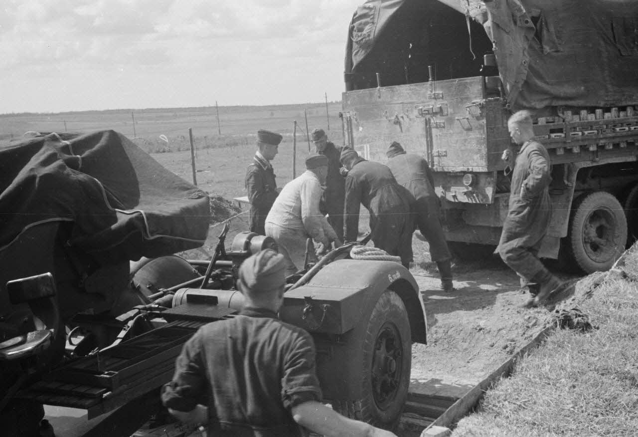 Chargement d'un affût de canon de 3,7 cm FlaK 18 peu avant le mouvement d'une batterie de DCA allemande.