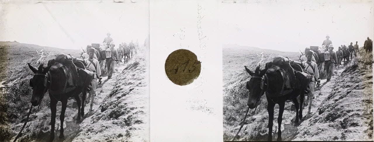 D68-42. Autour de Tananarive, les tirailleurs du 1er régiment de tirailleurs malgaches et les artilleurs de la 3e batterie du 7e régiment d'artillerie exécutent diverses manoeuvres. Ces évolutions sont destinées à apprécier la mobilité des batteries sur le terrain et à s'entraîner au tir. Le relief tourmenté, les cours d'eau et l'absence de routes praticables accentuent la difficulté des déploiements. Les rivières sont traversées à gué ou franchies sur d'étroites pirogues mises bout à bout. Deux types de canons de Bange de calibre de 80 mm sont alors utilisés : les canons de campagne, tirés par des attelages, et les canons de montagne, transportés en pièces détachées par des mulets. Les hommes sont équipés de mousquetons d'artillerie modèle 1892. Arrivés sur le champ de tir, les mulets sont déchargés et les pièces mises en batterie pour effectuer les exercices de tir.