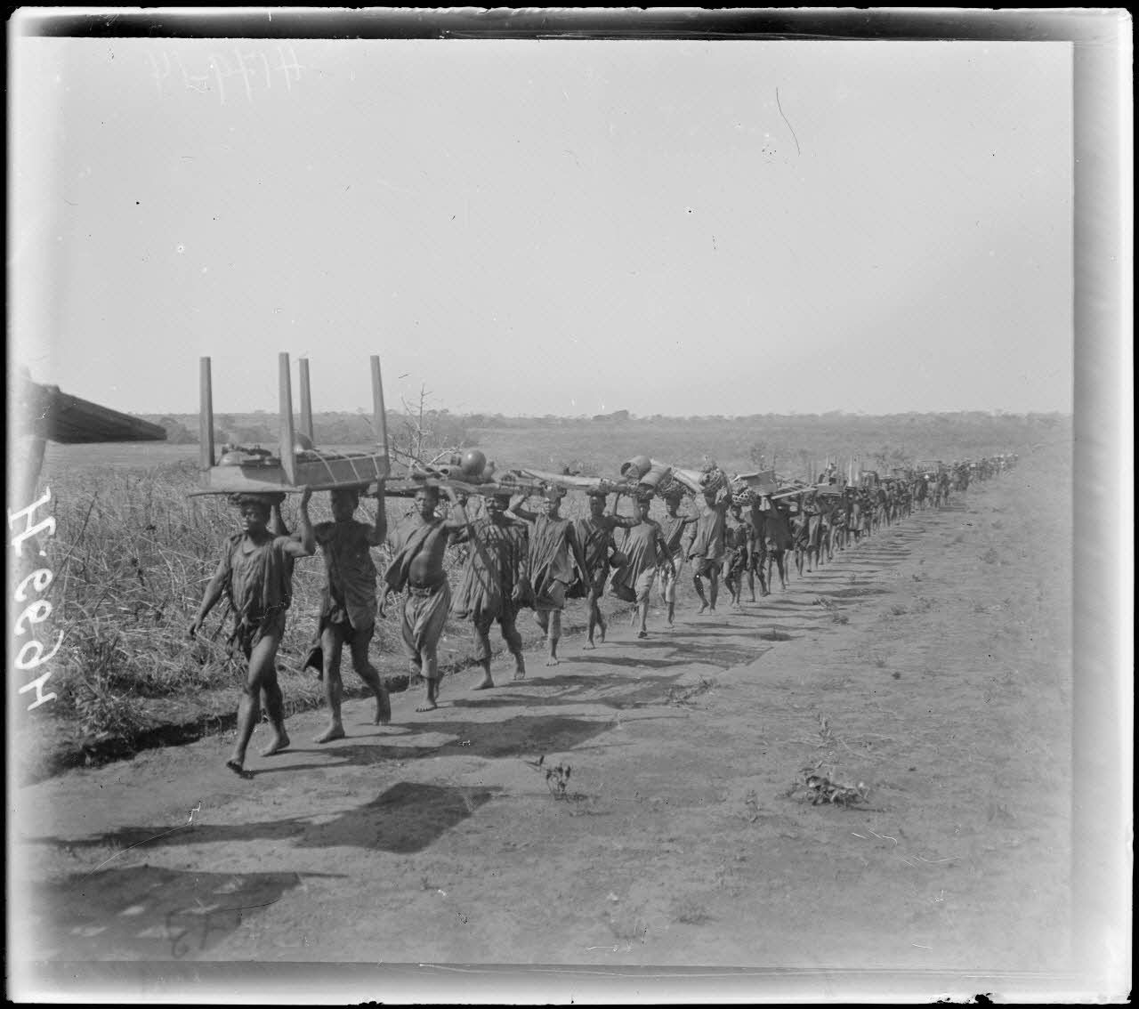 Route de Yoko à Tibati. Distribution de vivres aux porteurs.