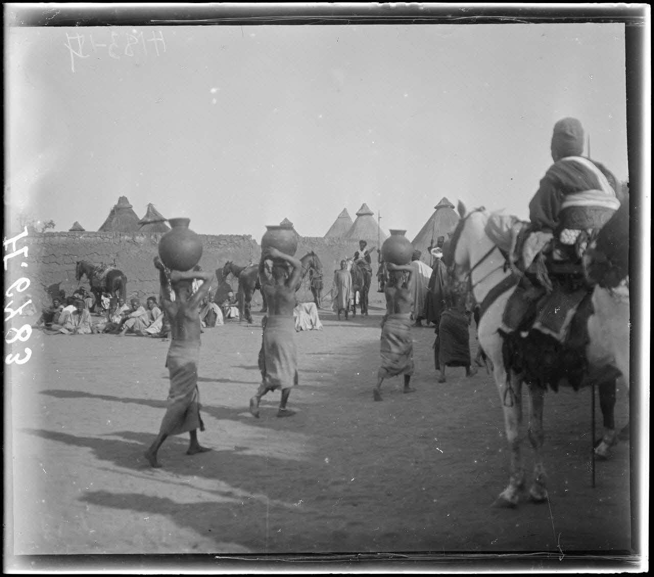 N'Gaoundéré village. Femmes portant de l'eau pour le sultan. [légende d'origine]