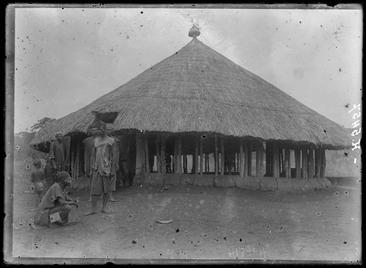 Au village de Nguila, au nord de Ntui, vue d'une case à palabres, vaste auvent cônique où se réunissent les anciens pour discuter.