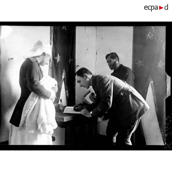 Toul (Meurthe-et-Moselle). Asile de Luxembourg. Croix-Rouge américaine. Un baptême ; le docteur Sharp, parrain signant le registre.