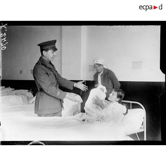 Toul (Meurthe-et-Moselle). Asile de Luxembourg. Croix-Rouge américaine. La maman présentant l'enfant au parrain, le docteur Sharp.