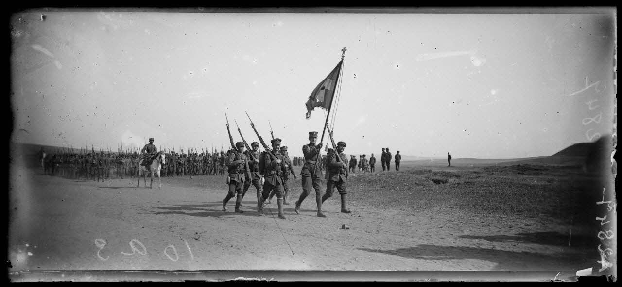 Naresch. Revue des troupes grecques, à son arrivée le Général Guillaumat salue le drapeau.