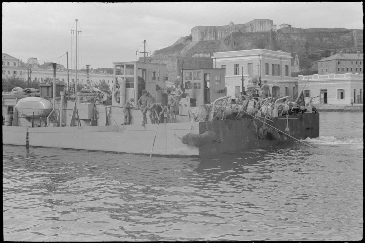 Des navires allemands de type Raumboot quittent le port de Corfou.
