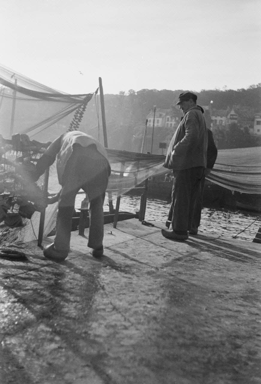 Nettoyage des filets de pêche dans le port de Douarnenez.