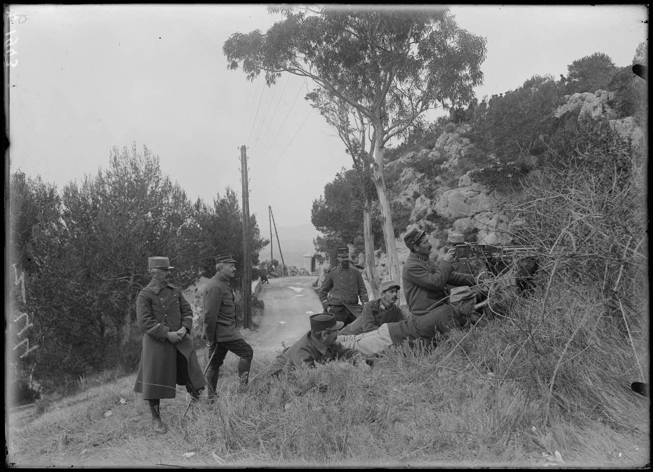 Nice. Fort de la Drète. Centre de mitrailleurs. En batterie derrière un buisson. [légende d'origine]