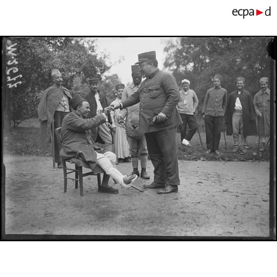 Nogent-sur-Marne, hôpital du jardin colonial. Le docteur donne à un blessé un paquet de tabac.