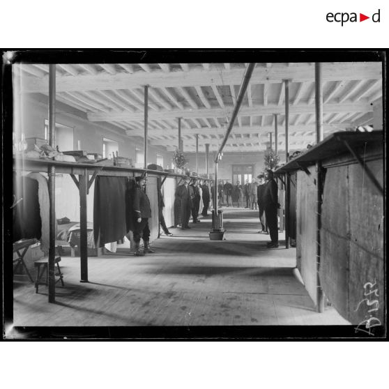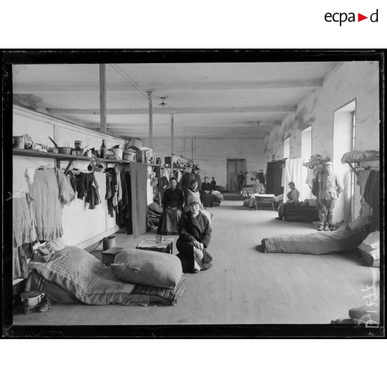 Angers, Maine-et-Loire, dépôt de Mongazon,détails d'installation d'un grand dortoir. Groupe d'allemands.