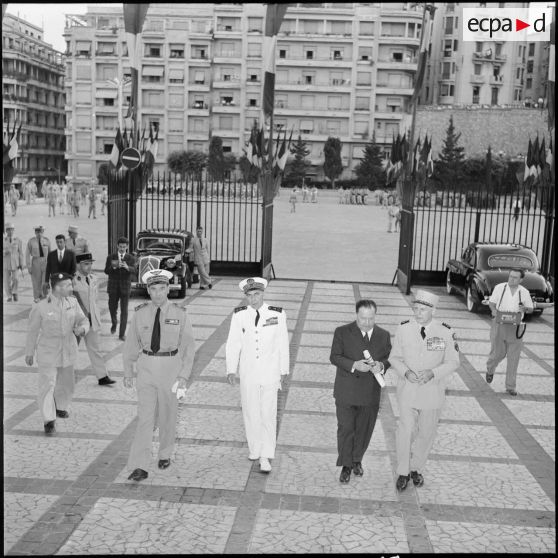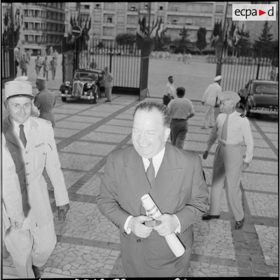 Forum d'Alger. Le ministre résident Robert Lacoste et le général Salan quittent le bâtiment du gouvernement général.