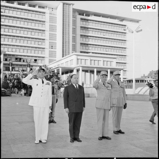 Plusieurs autorités militaires assistent à cette cérémonie : le général d'armée Raoul Salan est chargé d'épingler le galon de caporal sur la manche du ministre ; les généraux Jouhaud et Allard, ainsi que le vice-amiral Auboyneau, sont également présents.