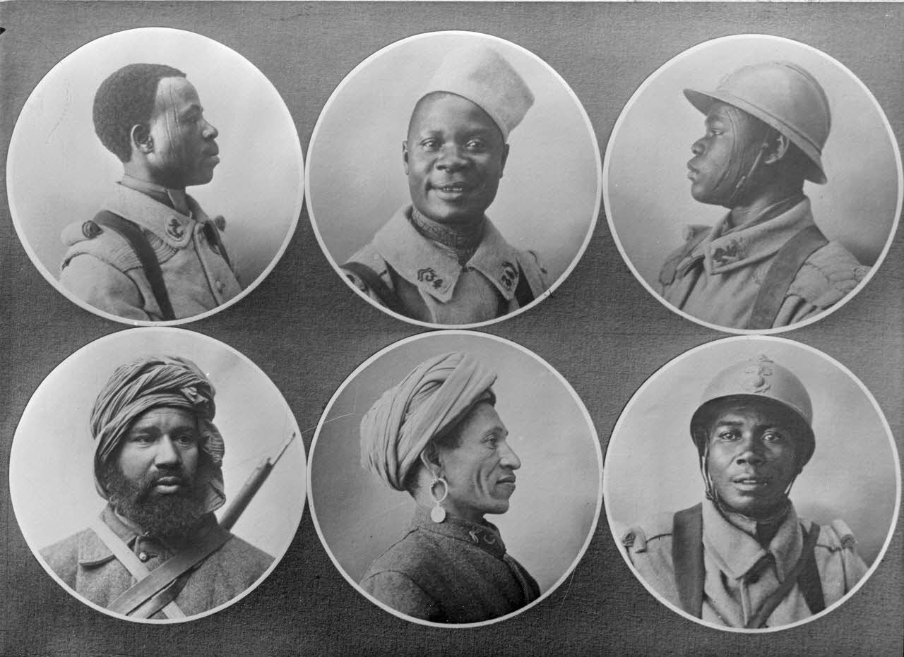 Nos braves auxiliaires exotiques : Sénégal, Guadeloupe, Soudan, Algérie, Maroc, Madagagascar. [légende d'origine]