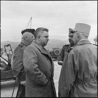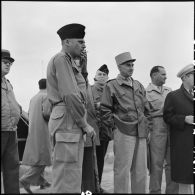 Le secrétaire d'état est entouré d'autorités militaires et civiles, dont le général Navarre,…