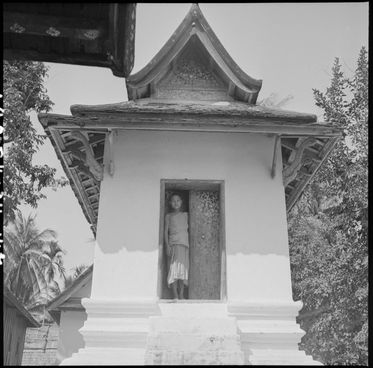 Jeune bonze posant dans l'encadrement d'une porte du Vat Khili.