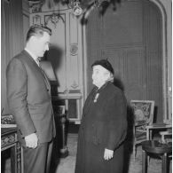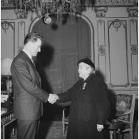Femme rapatriée d'Algérie serrant la main d'un…