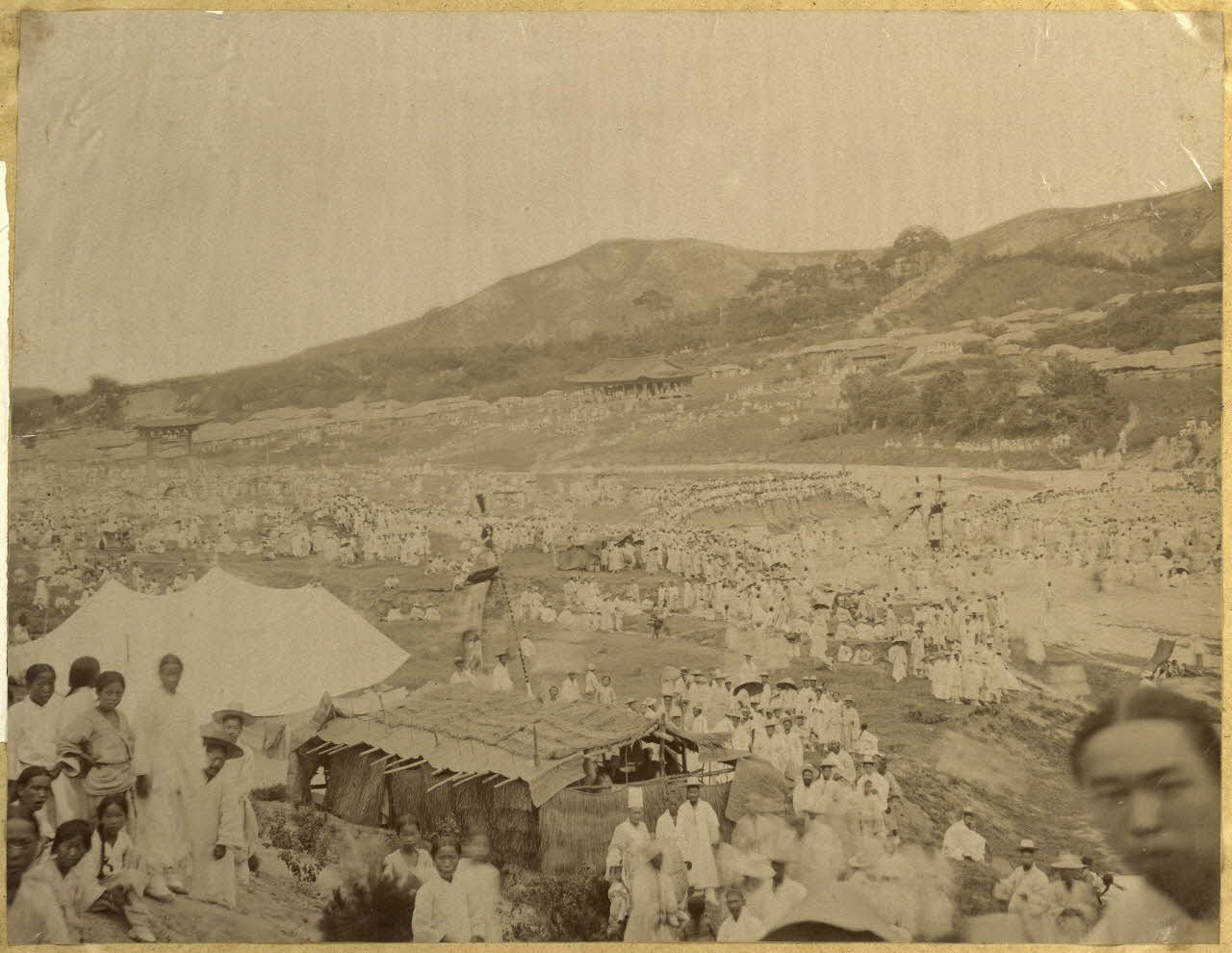 Cette épreuve sur papier albuminé représente la cérémonie des funérailles de la reine mère à Séoul le 11 octobre 1890.