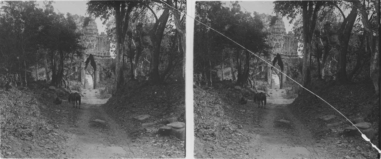 [Entrée d'Angkor Thom par la porte sud, vers 1900-1910.]