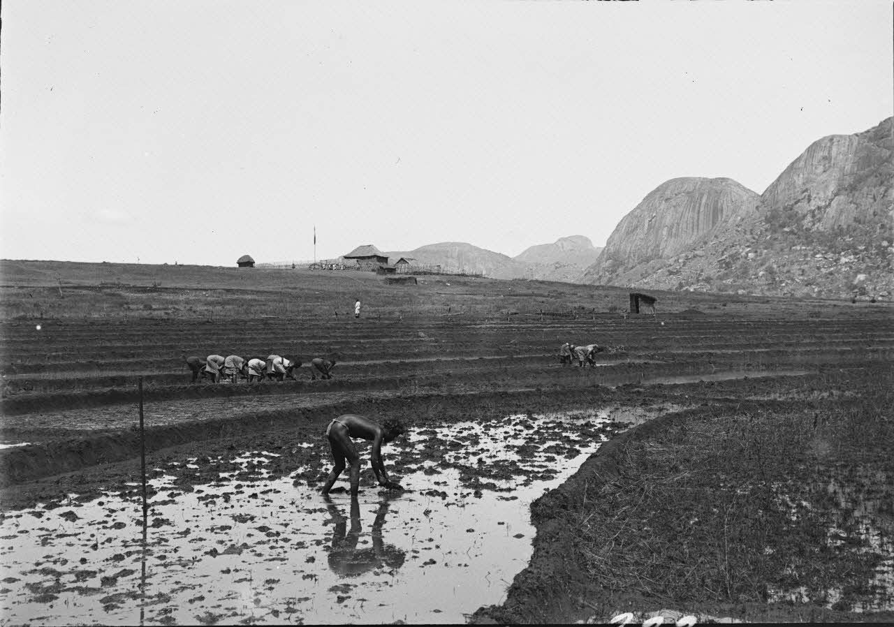 Malgaches au travail dans les rizières du village d'Antambohobe.