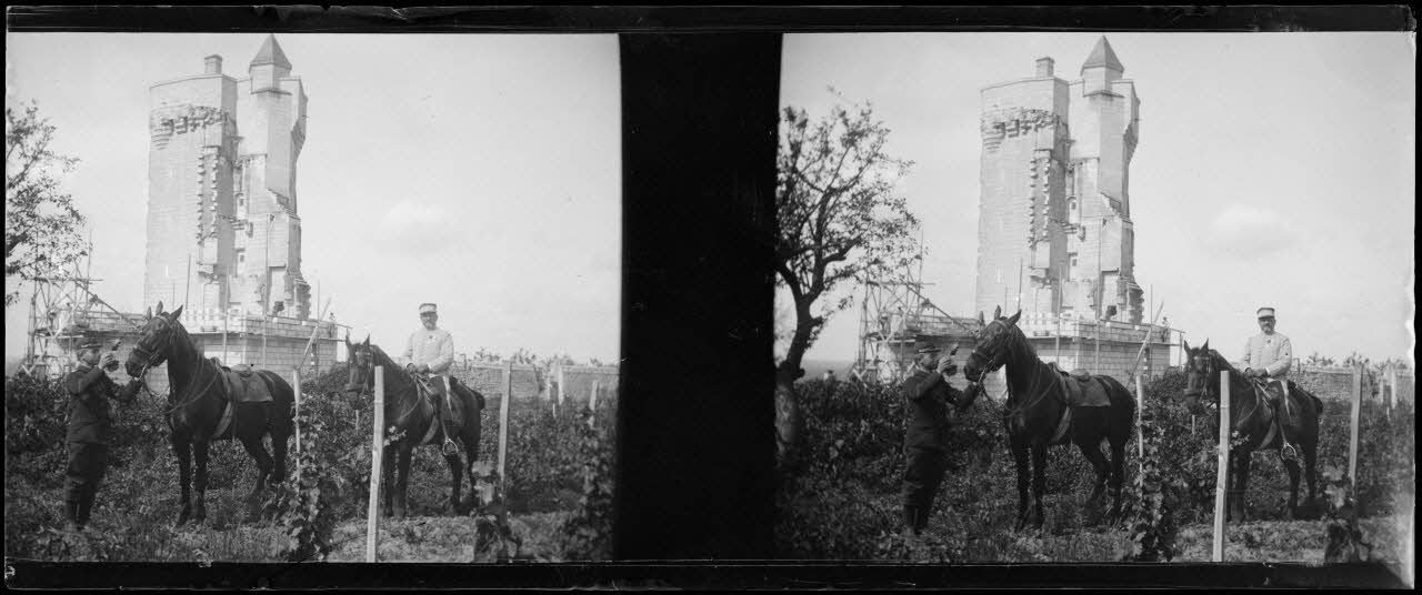 [Deux officiers à cheval près d'une tour fortifiée]