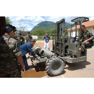 Déchargement du matériel technique par les militaires français et des professeurs du lycée de Deçan à l'aide d'un Transmanut.