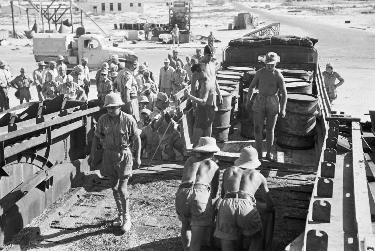 Dans le port de Marsa Matruh, le déchargement du ravitaillement de l'Axe par des prisonniers anglais et néo-zélandais.