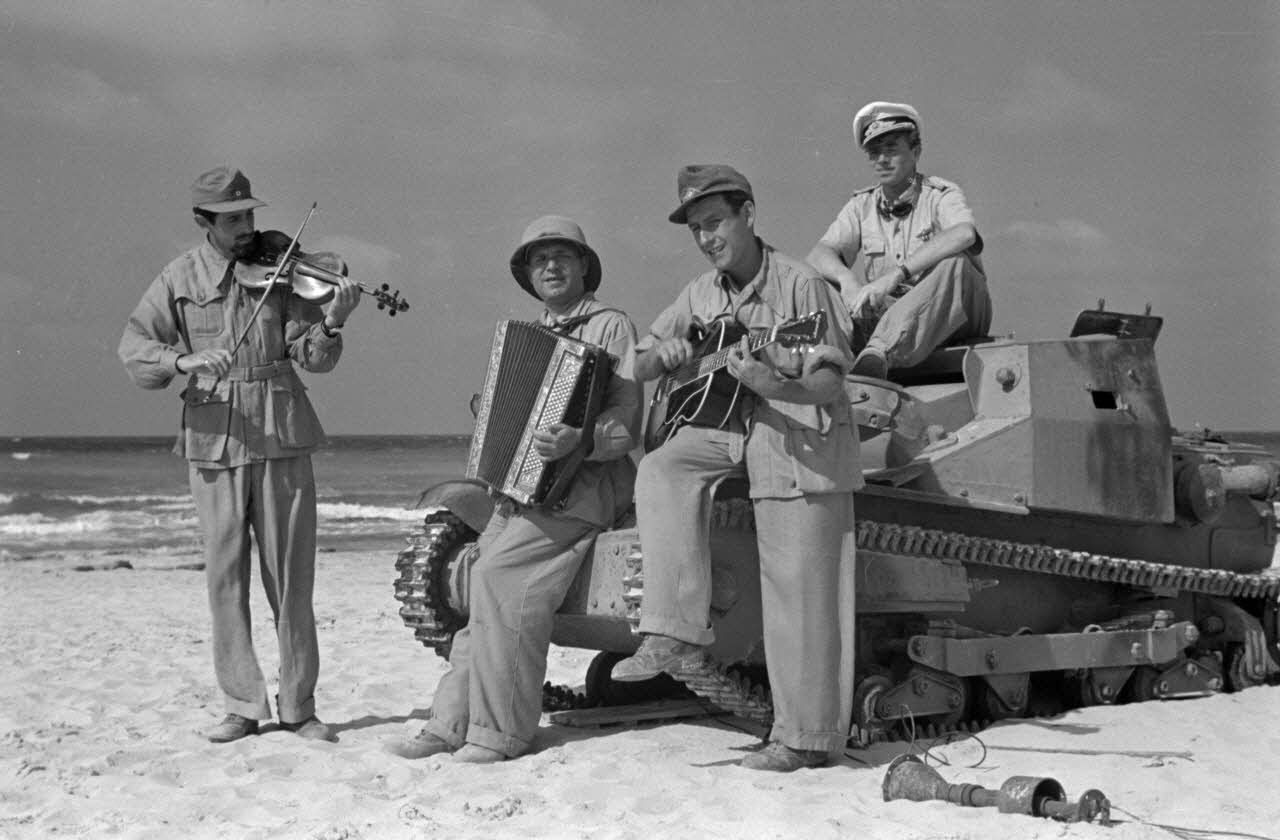 Sur une plage d'Egypte (El Quasaba), des membres de la KDF (Kraft durch Freude) jouent de la musique et chantent.