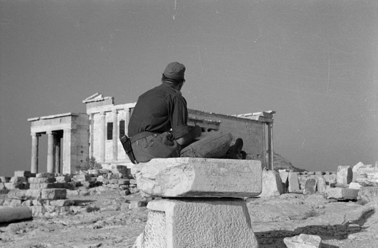 Le général Otto Hoffmann von Waldau inspecte des aviateurs sur un terrain d'aviation de Kalamaki puis quelques aspects de l'acropole à Athènes.