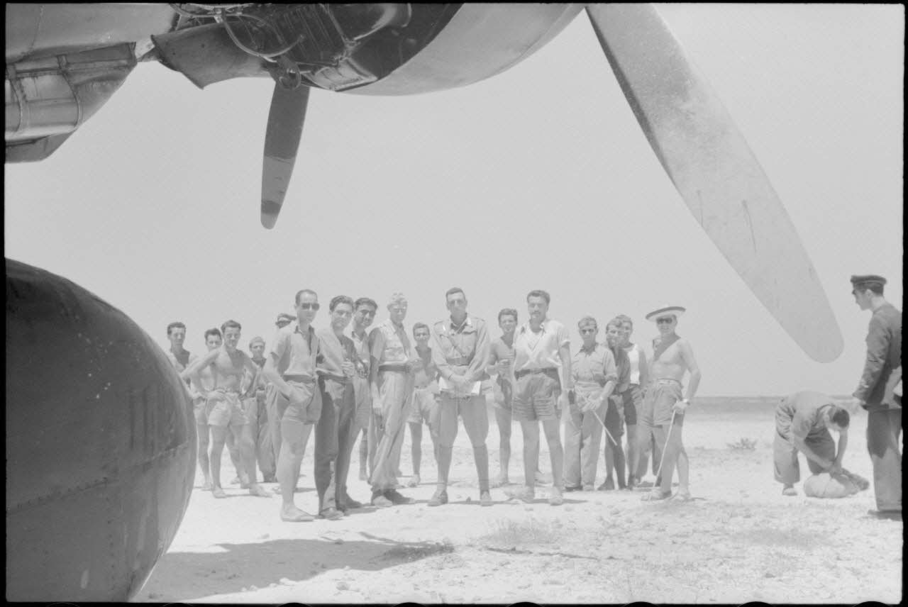 Le reporter Valentin Krempl parmi des personnels de l'armée de l'air italienne et notamment l'équipage d'un avion de transport Savoia Marchetti SM-81.