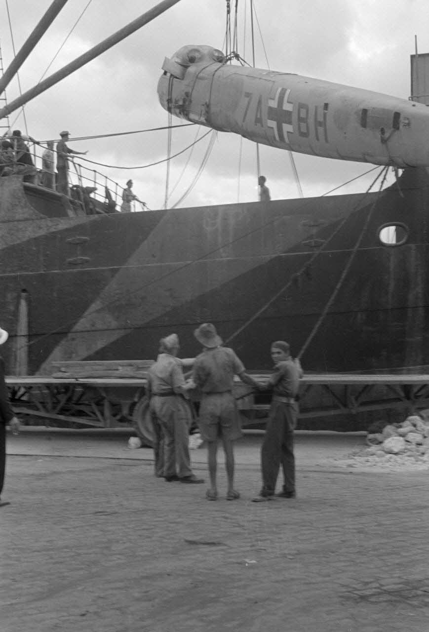 Un Dornier Do-24 et un hydravion Junkers W-34 d'une unité côtière non-identifiée de l'armée de l'Air allemande. Des mécaniciens effectuent une maintenance sur des Arado Ar-196 du 126e groupe de reconnaissance (Aufklärungsgruppe 126). On remarque l'immatriculation de l'Arado D1+ GI. Dans un port, la vedette de la Luftwaffe imamtriculée FL.B.435 Flugsicherungsboot (DAM 1436 L11). Dans un port, des futs et des jerrycans sont déchargés d'un cargo. La carcasse d'un bombardier Junkers Ju-88 du 121e groupe de reconnaissance (Aufklärungsgruppe (F)121) immatriculé 7A+BH (DAM 1436 L23 et L24). La carcasse d'un hydravion Arado Ar-196 a été déchargé du cargo. On remarque le début de l''immatriculation "D1" qui identifie les avions du 126e groupe de reconnaissance. Une vedette rapide (Schnellboot) de la 3e Flotille dont on aperçoit l'insigne qui semble être un crocodile (DAM 1436 L29 à L30).